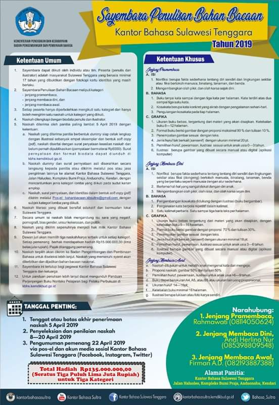 Batas pengumpulan karyanya pada 5 April 2019. Untuk informasi secara rinci, Kantor Bahasa Sultra menyebarnya pula melalui Facebook, Instagram, Twitter, dan Website mereka.